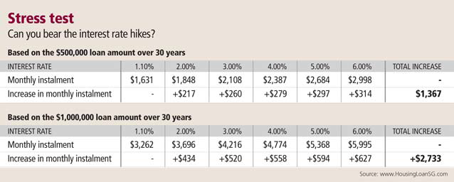 The housing loan rates that banks offer to home buyers are higher than Sibor as banks will add on a mark-up. The mark-up ranges from 0.75 to 1.5 per cent currently (as at Feb 18, 2013). Based on the three-month Sibor of 0.38 per cent as at the same date this will translate into a home loan rate of about 1.13 to 1.88 per cent. If Sibor were to increase to 4.5 per cent, the home loan rate will be higher, at 5.25 to 6 per cent instead, after adding the mark-up. Based on the current interest rate of about 1.1 per cent for a 30-year loan of $500,000, the instalment works out to be $1,631 per month. If the interest rate rises to 2 per cent, the monthly instalment will go up $217 to $1,848. The increase in instalment can be as much as $1,367 per month if the interest rate increased to 6 per cent. However, if the loan quantum were to double to $1,000,000, the additional payment per month will double as well.